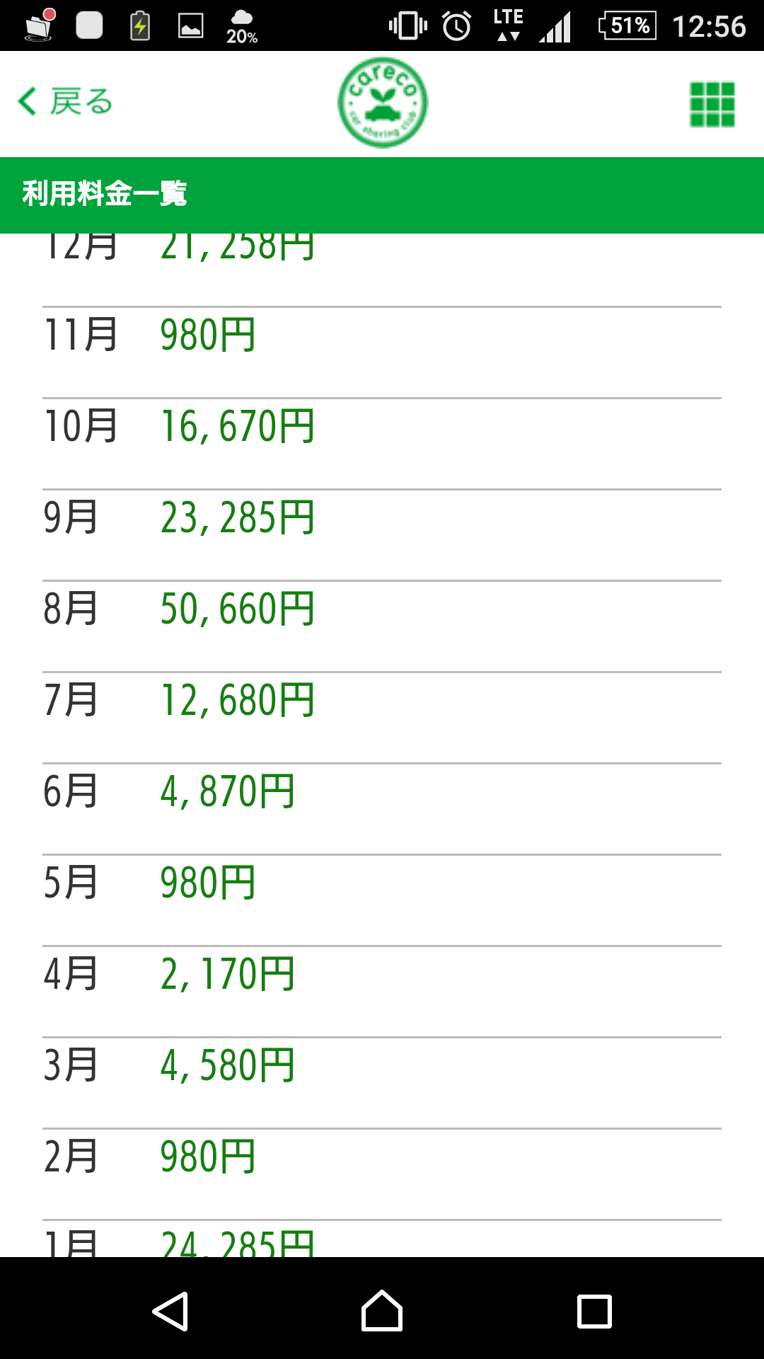 メインカード、カレコの明細。年間163,398円。月当り13,616円